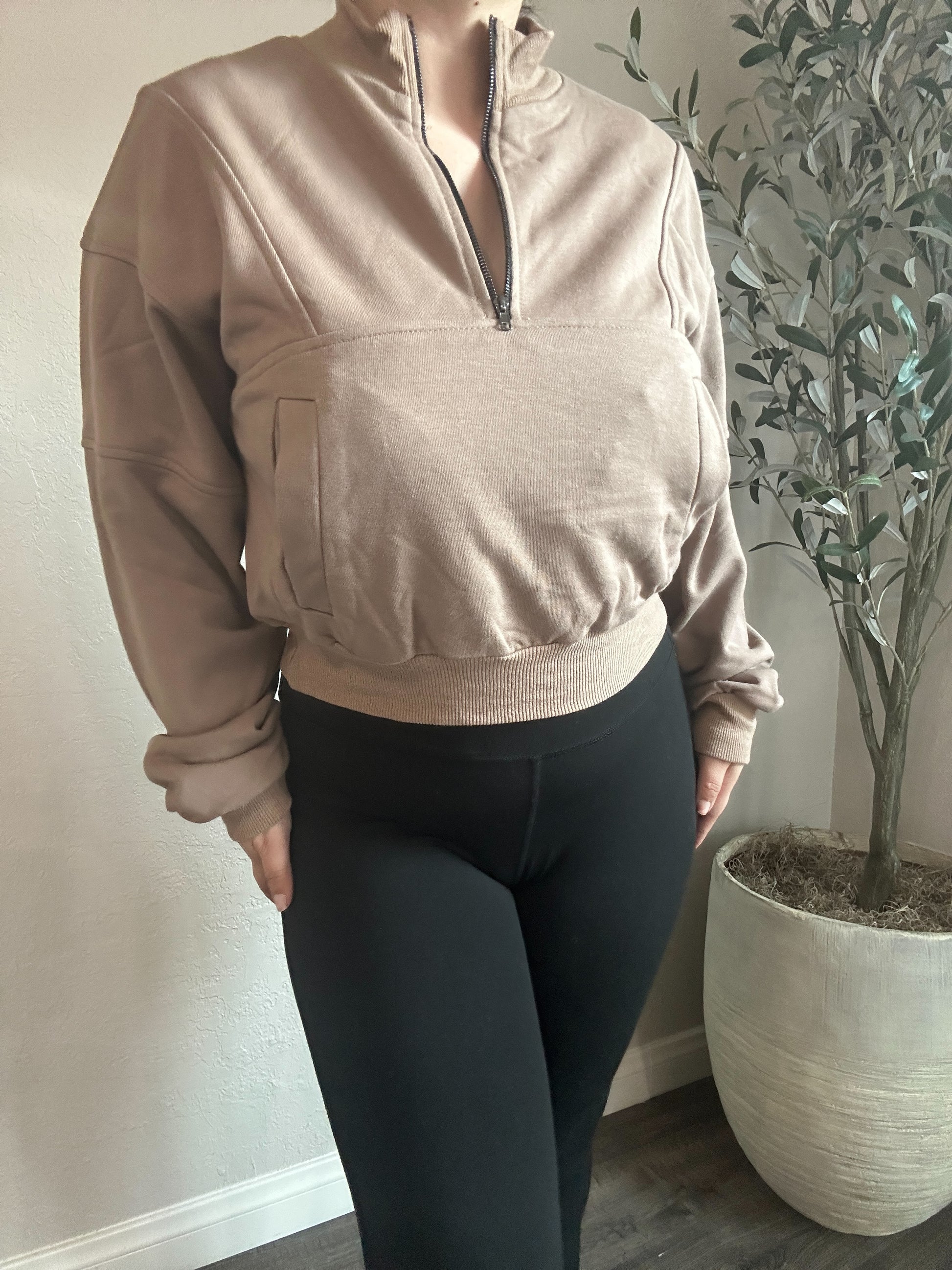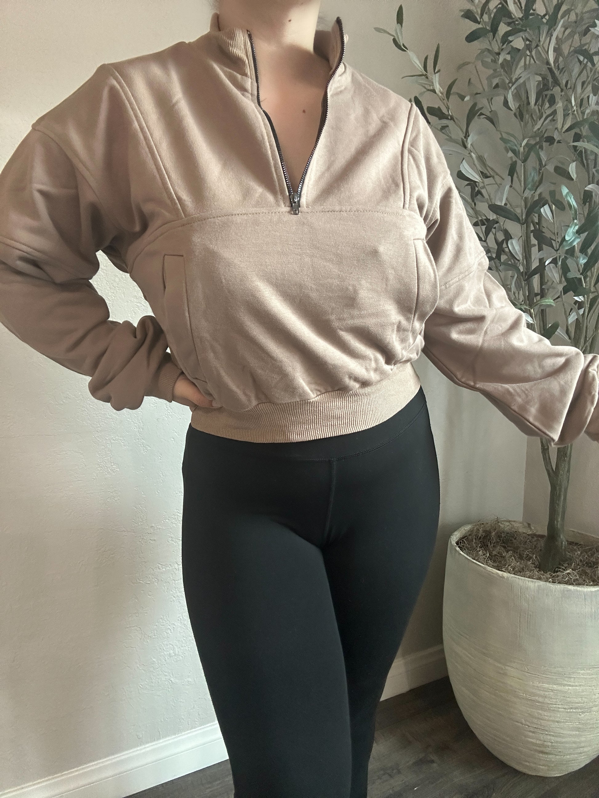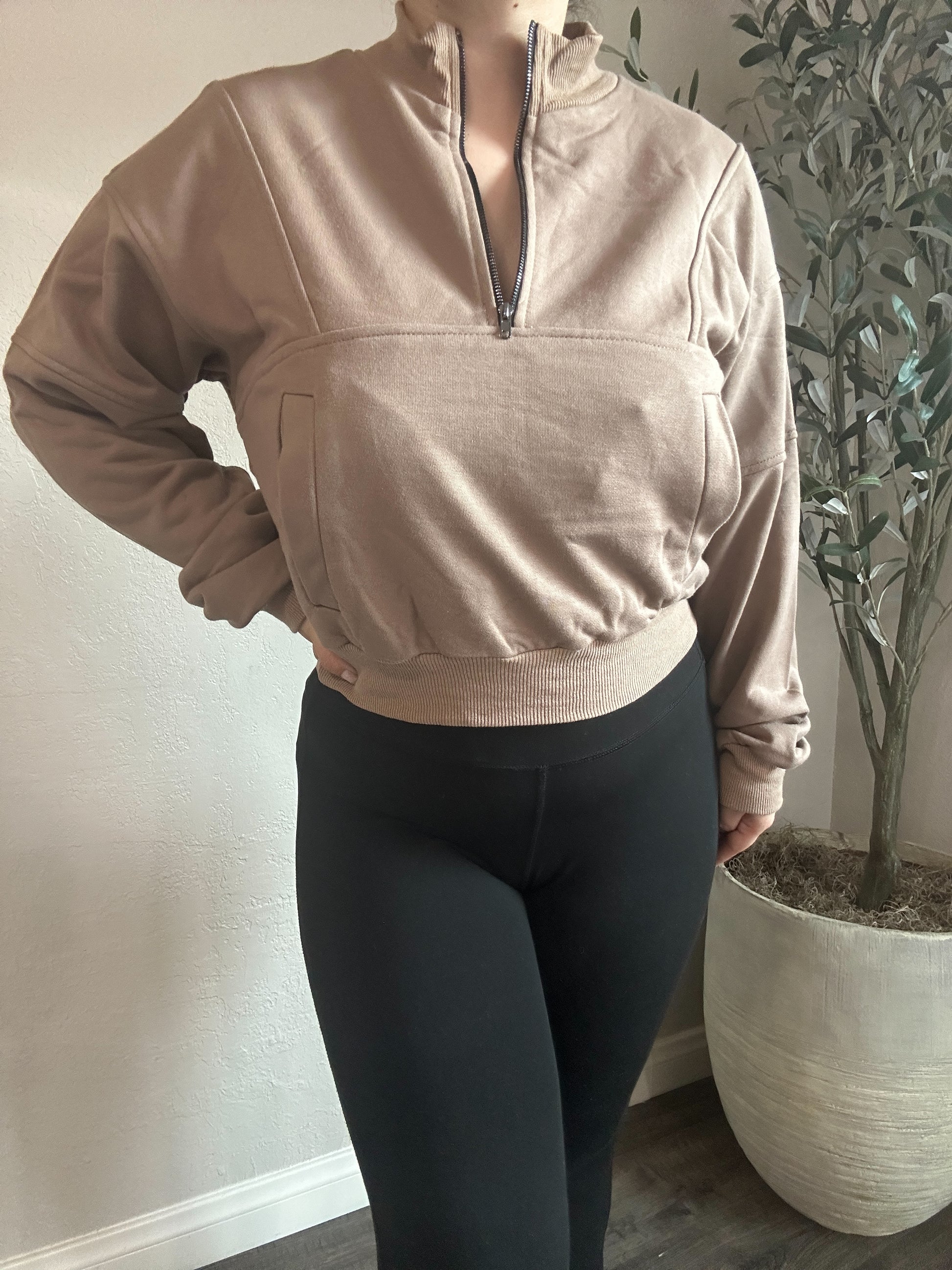 Model weighs 140lbs typically wears US size M in tops and US size S in outerwear. Wearing US size S in Lux Half Zip Up Sweater.