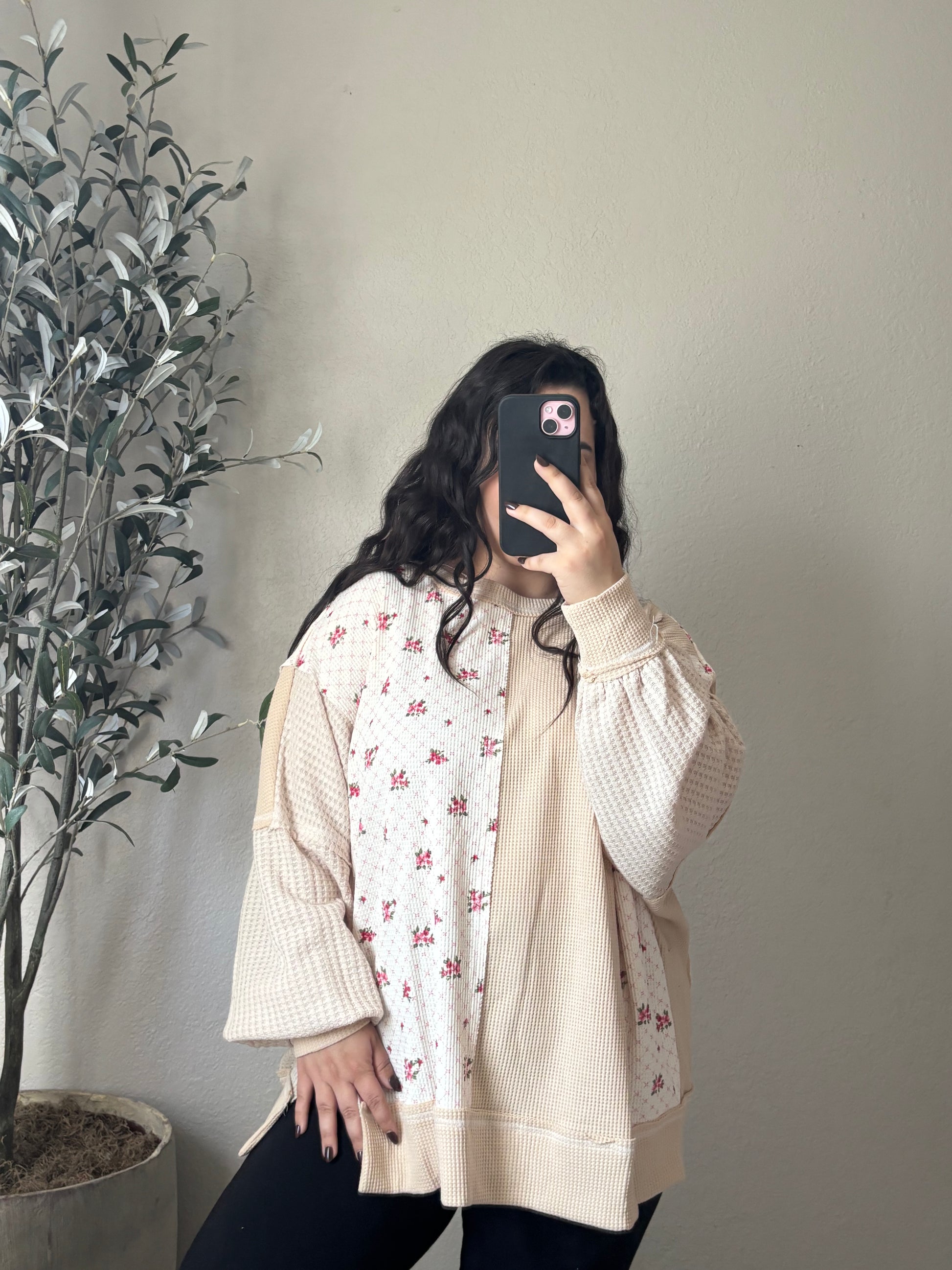 Cozy meets feminine in the Prairie Roses Pullover — your new go-to for soft, effortless style. This oversized pullover features a dreamy waffle knit texture and a delicate pink floral print that blooms against a neutral mix of oatmeal and cream tones. Perfectly relaxed and beautifully detailed, it’s the kind of piece you’ll reach for season after season.