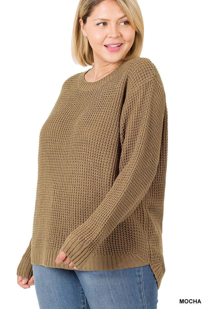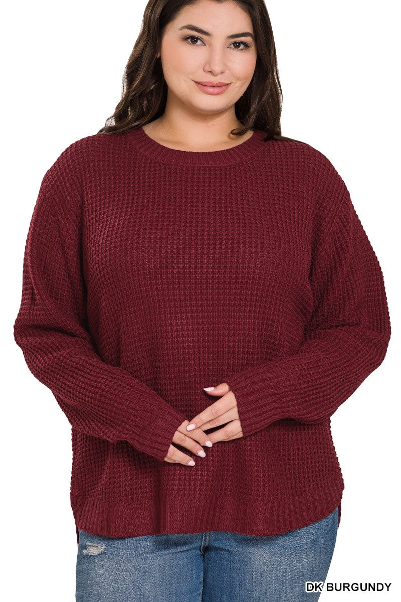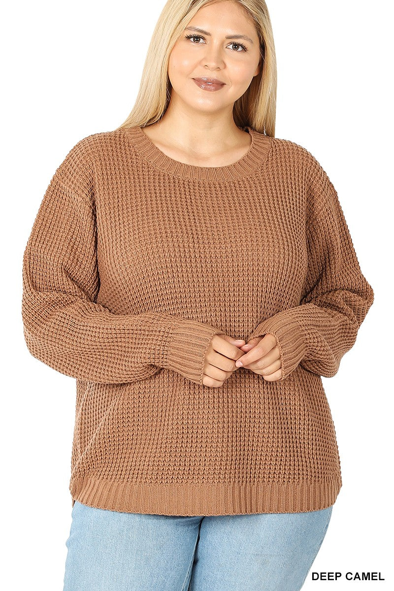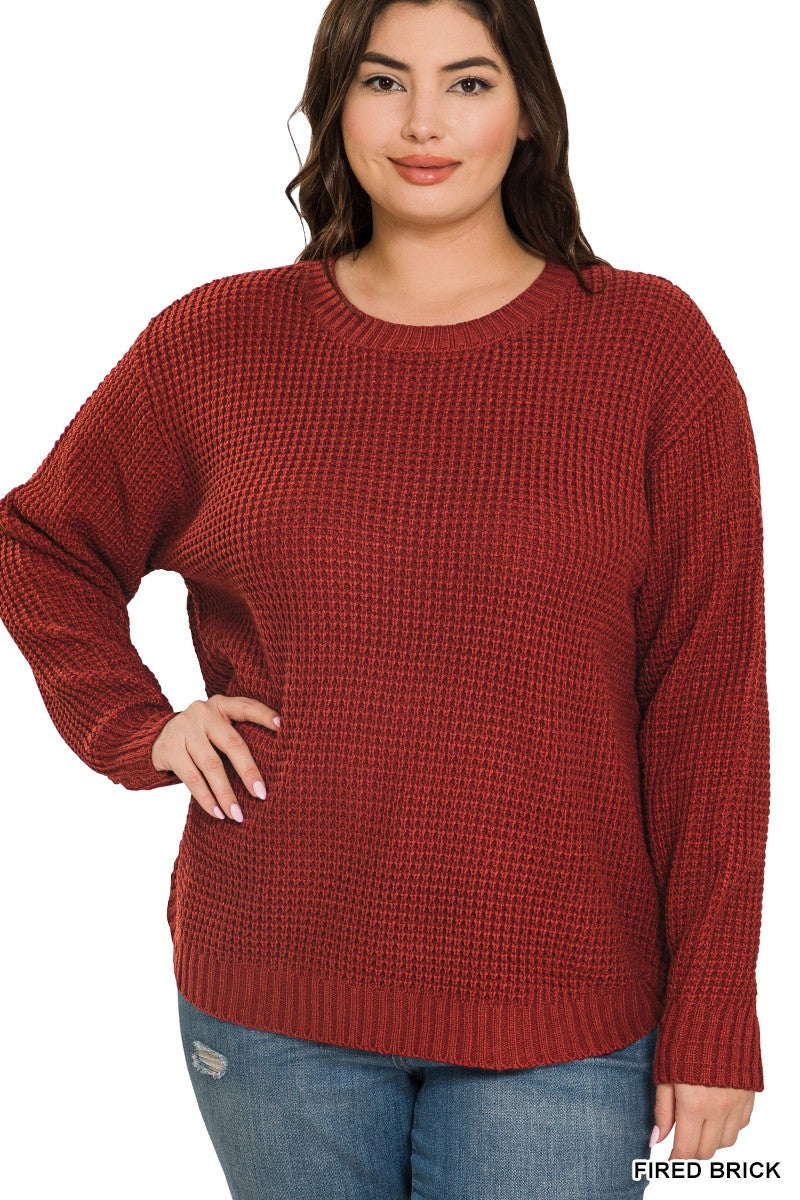 Similar to our Carly Cardigan, our Claudia Sweater is buttery soft and features a waffle knit material. It is midweight and slightly oversized.