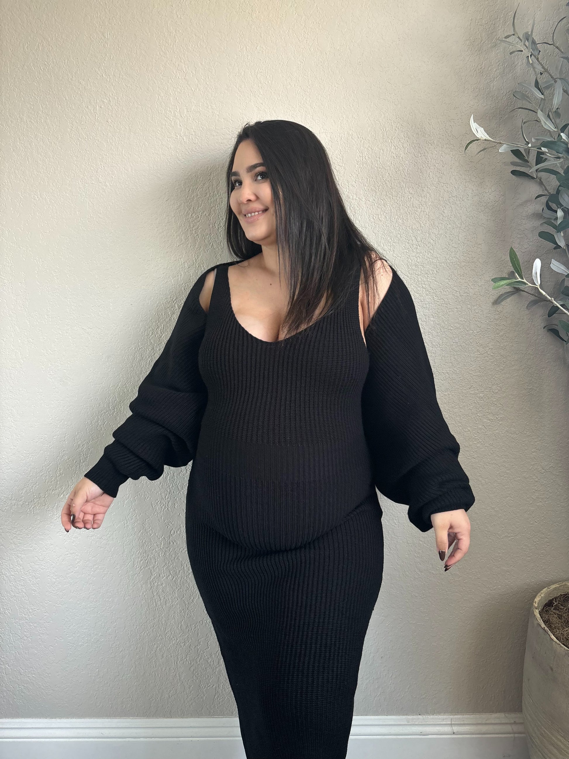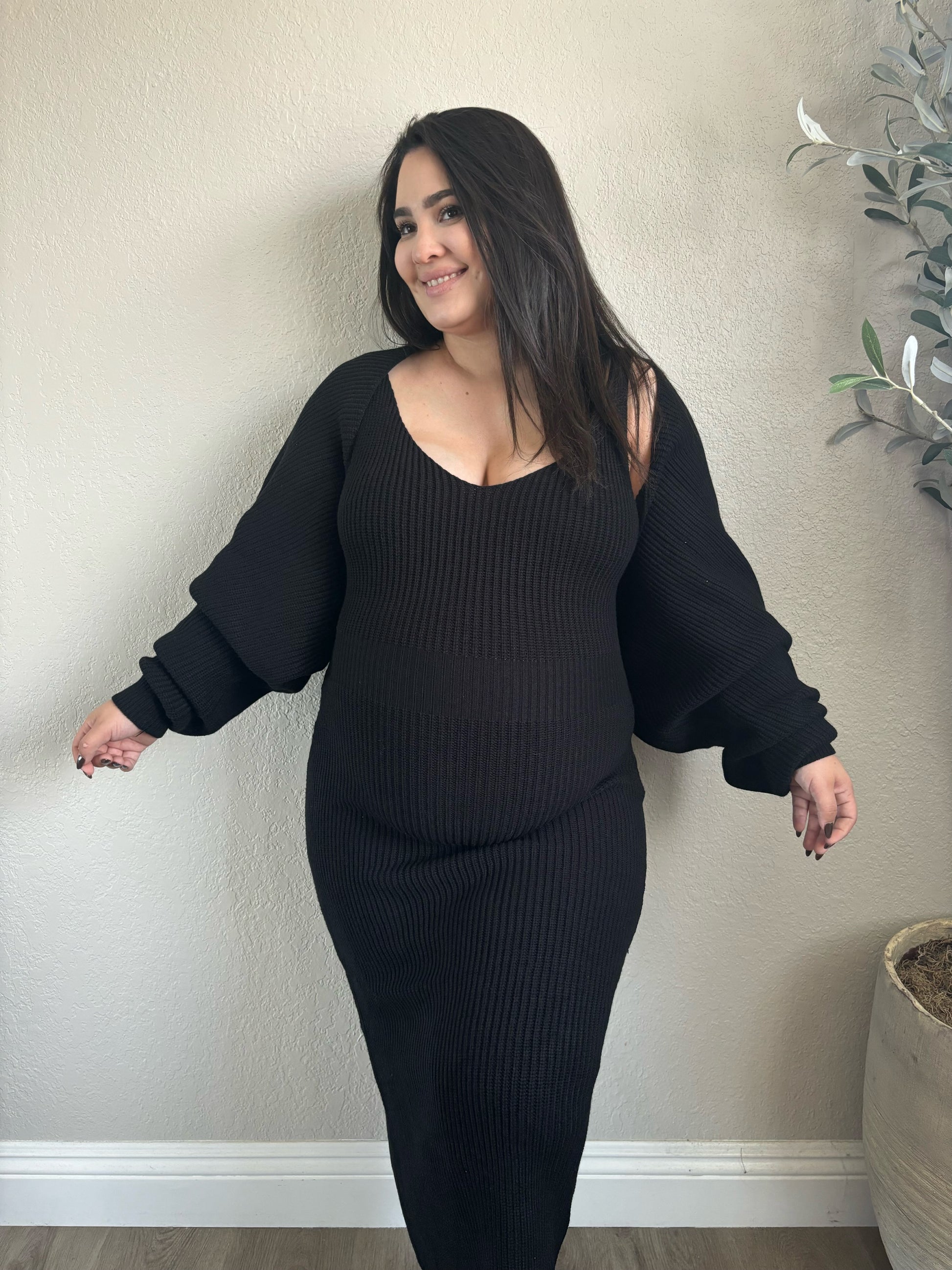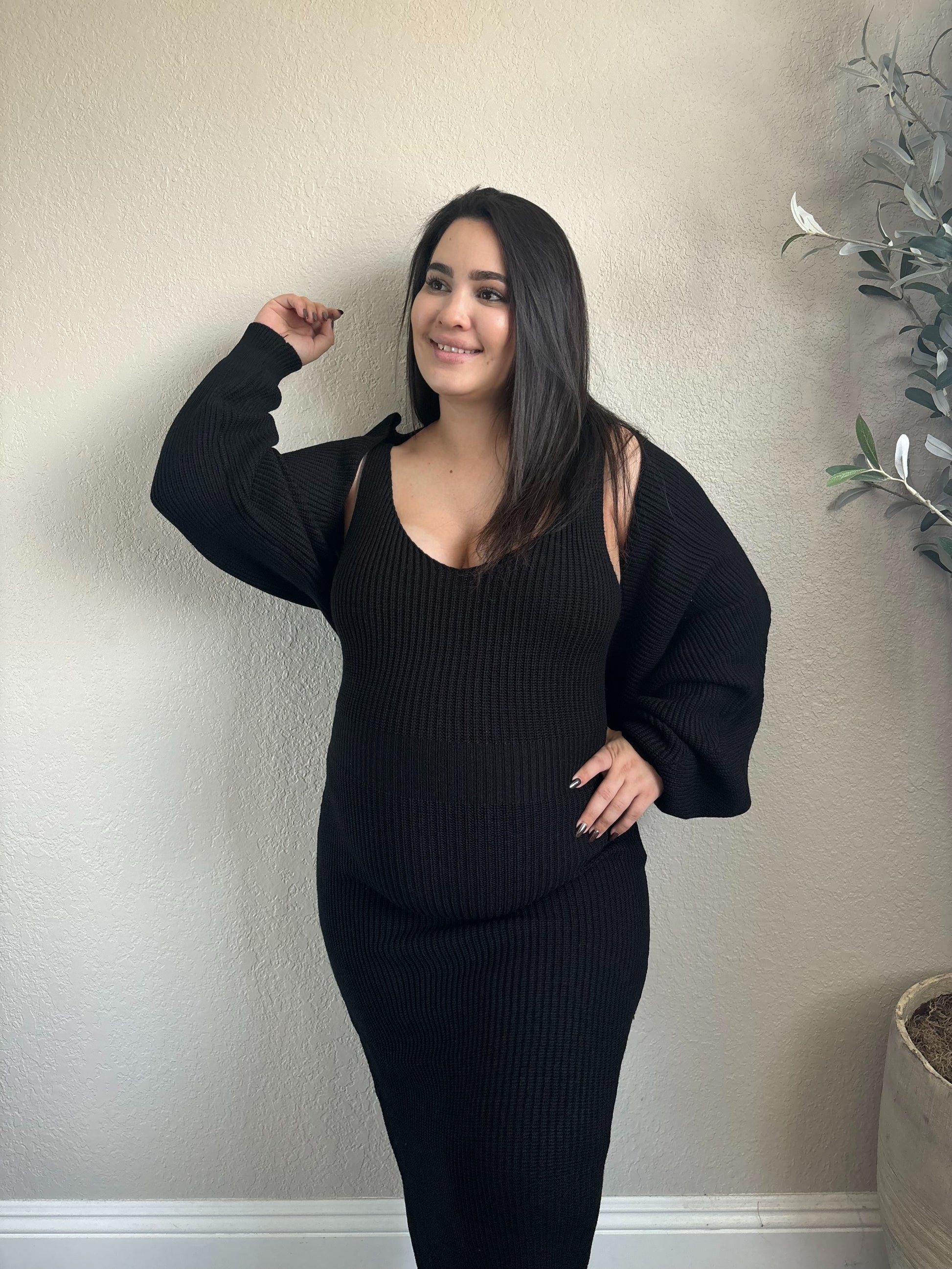 Knit V-Neck Midi Dress & Shrug Set- Black