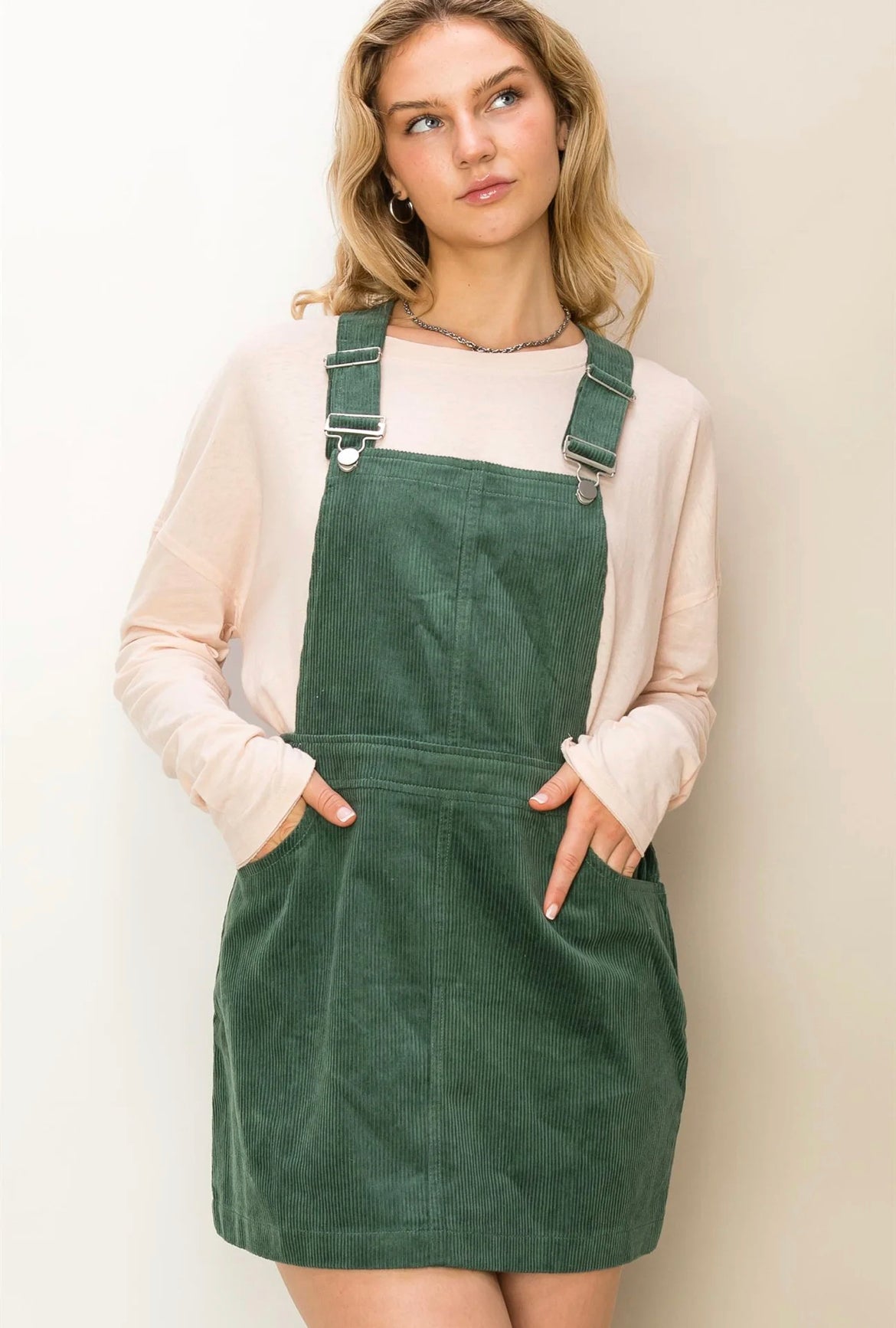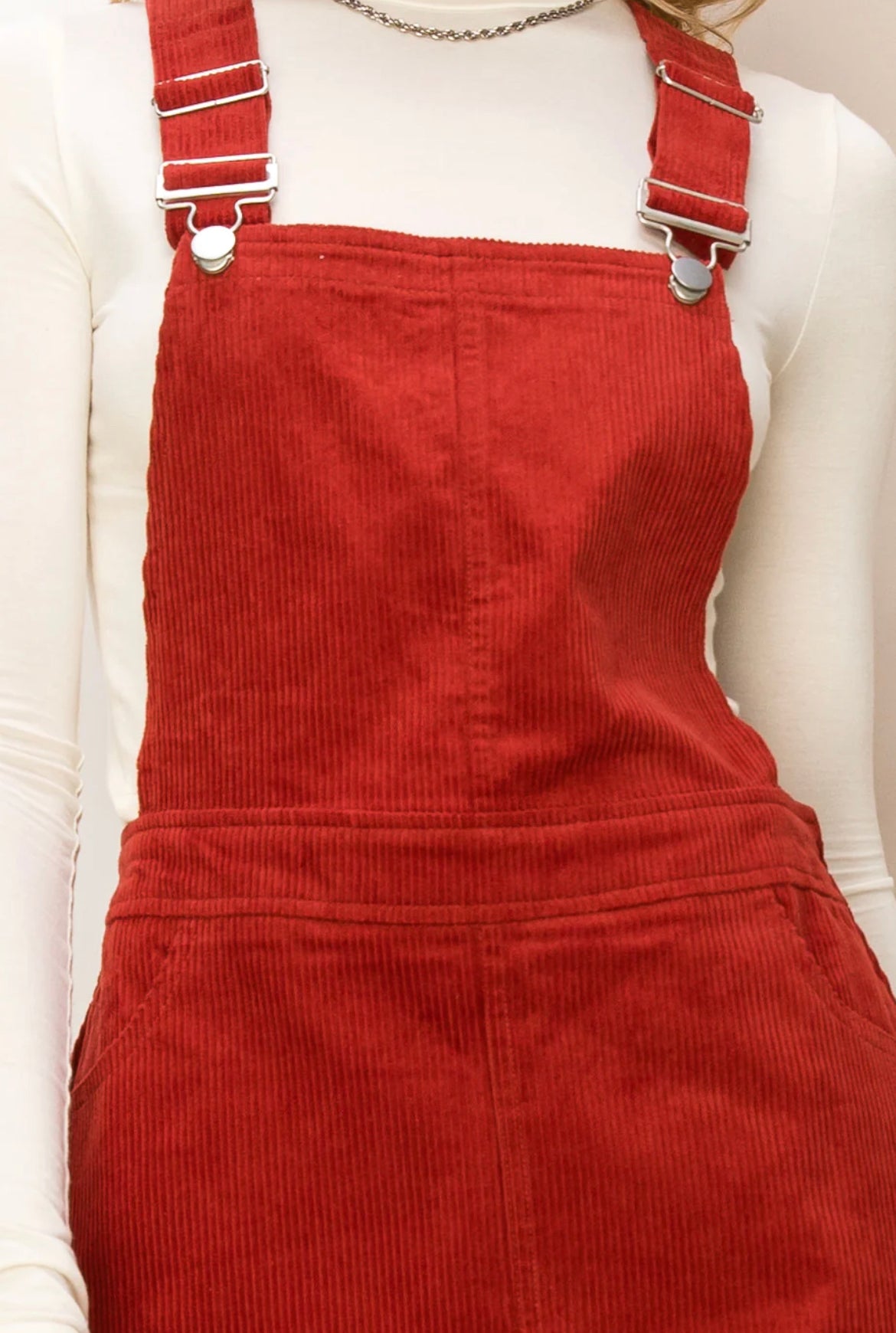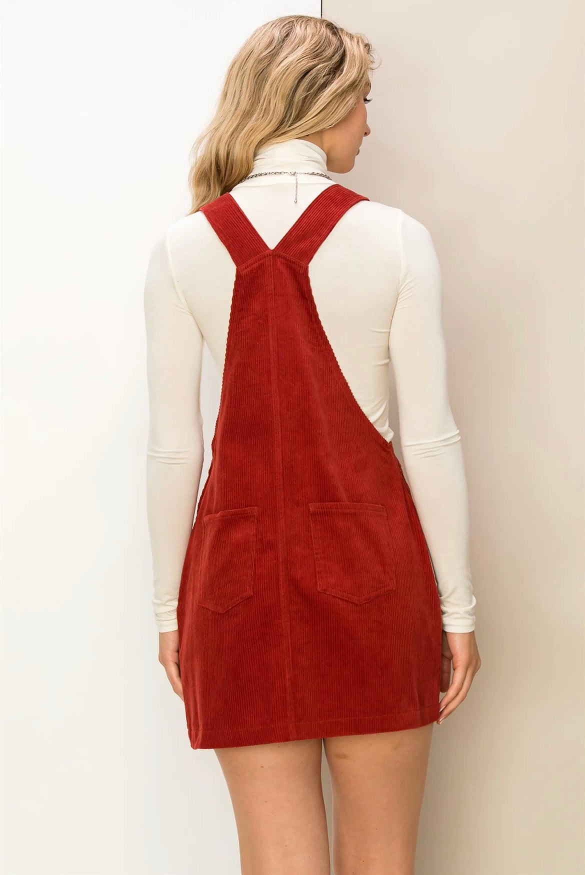 MADE FROM CORDUROY FABRIC, THIS OVERALL DRESS IS FEATURED IN A RETRO OVERALL STYLE AND SHAPES A STRAIGHT NECKLINE WITH THICK SHOULDER STRAPS. BACK POCKETS AND SIDE ZIPPER CLOSURE COMPLETE THE LOOK.