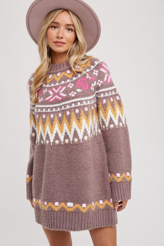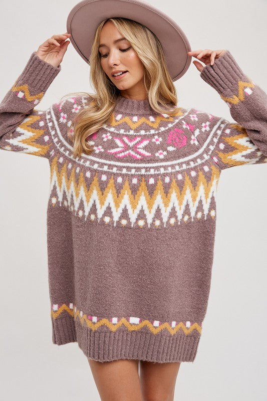 Introducing a cozy and stylish Fair Isle sweater dress pullover. This dress seamlessly combines warmth with fashion, making it a delightful choice for chilly days and winter events. The Fair Isle pattern adds a touch of classic charm, showcasing intricate designs and contrasting colors. The dress silhouette is versatile, allowing you to pair it with leggings or tights for added warmth or wear it on its own for a more casual look.