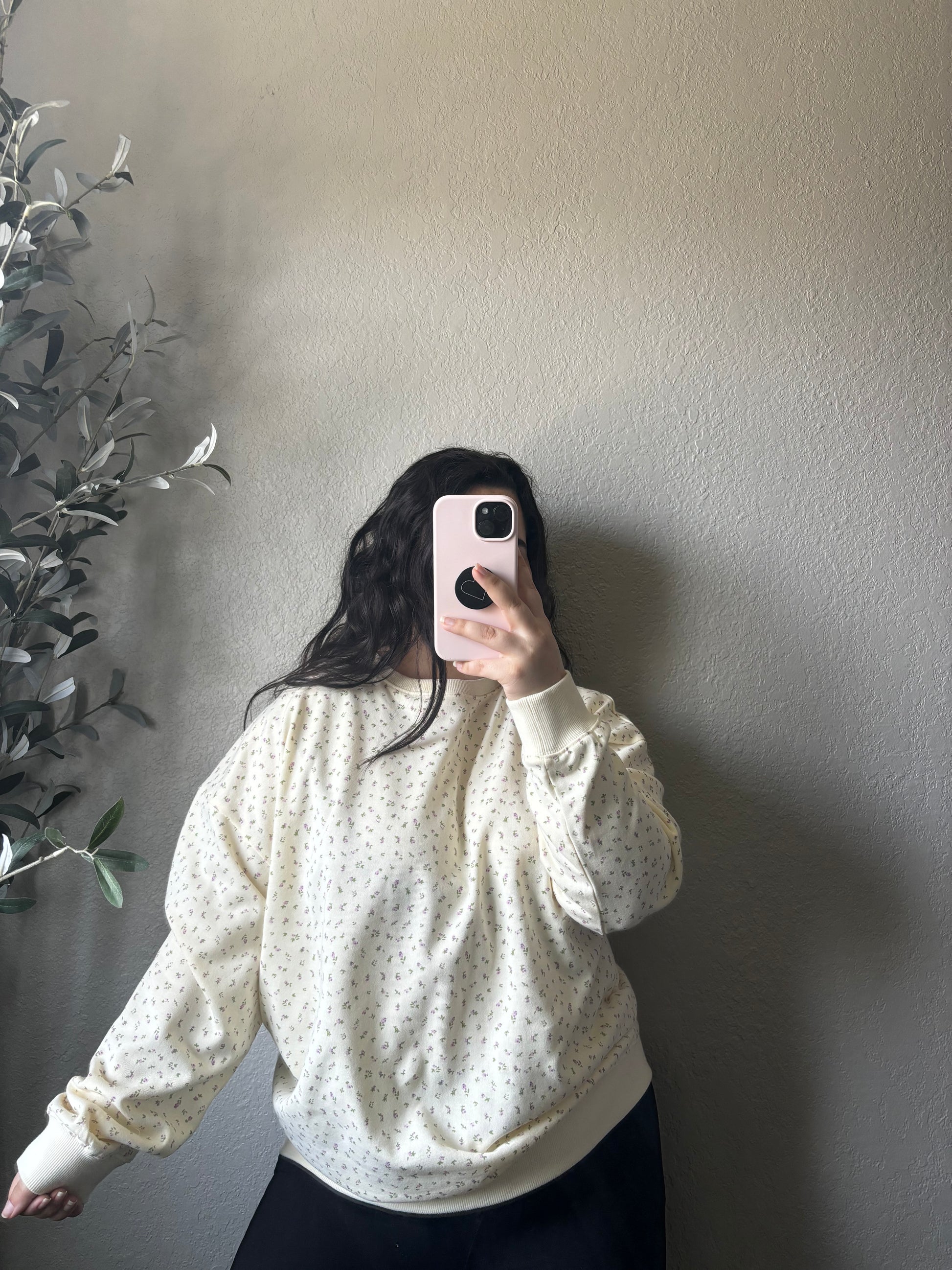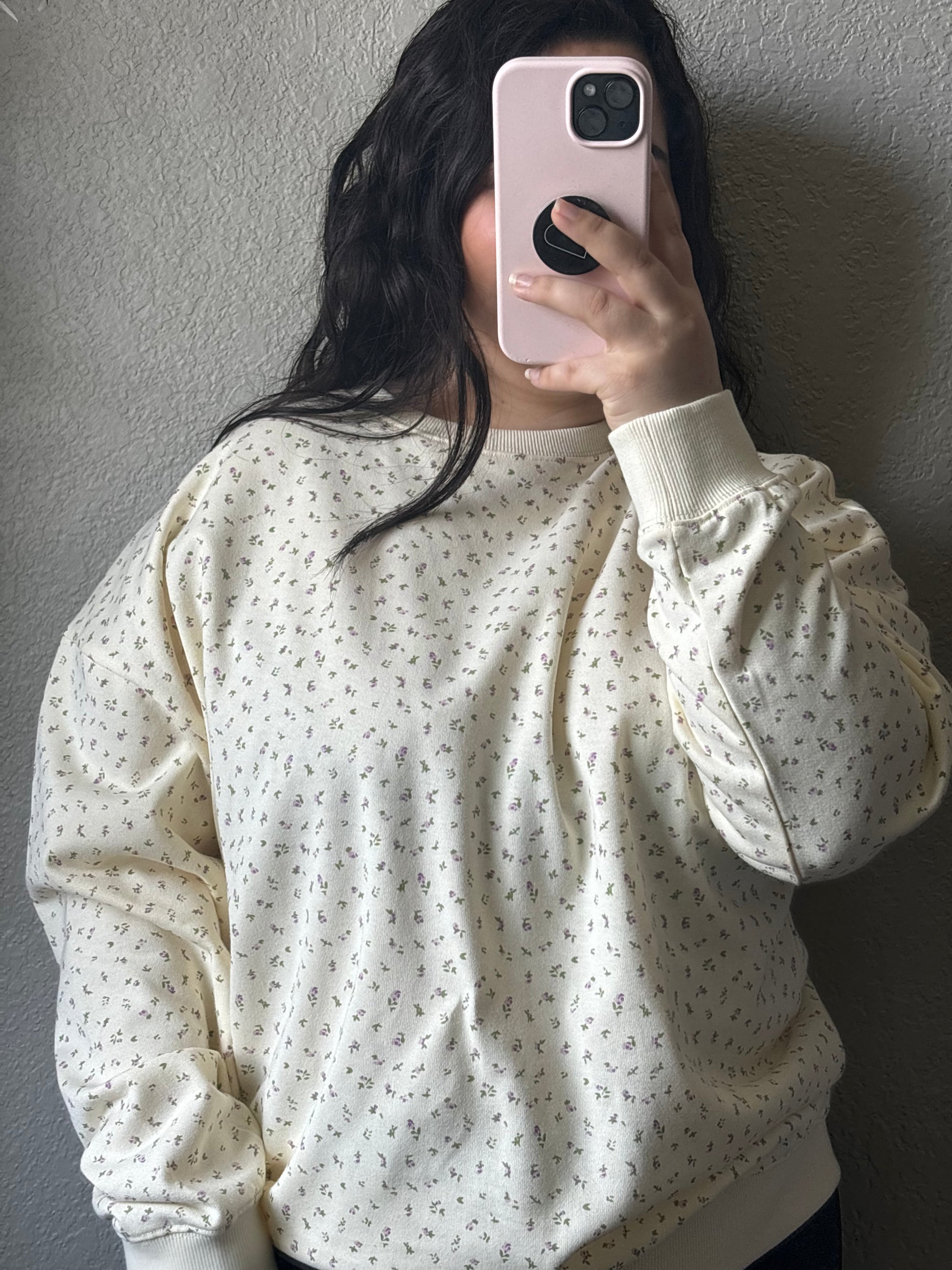 Soft, sweet, and effortlessly cozy — our Lavender Haze Pullover is the perfect blend of comfort and charm. This lightweight crewneck sweatshirt features an ivory base sprinkled with tiny lavender floral prints, adding a subtle feminine touch to your everyday wardrobe. The relaxed fit, ribbed cuffs, and neckline make it easy to throw on for a coffee run, chill day in, or layered up for a breezy evening.