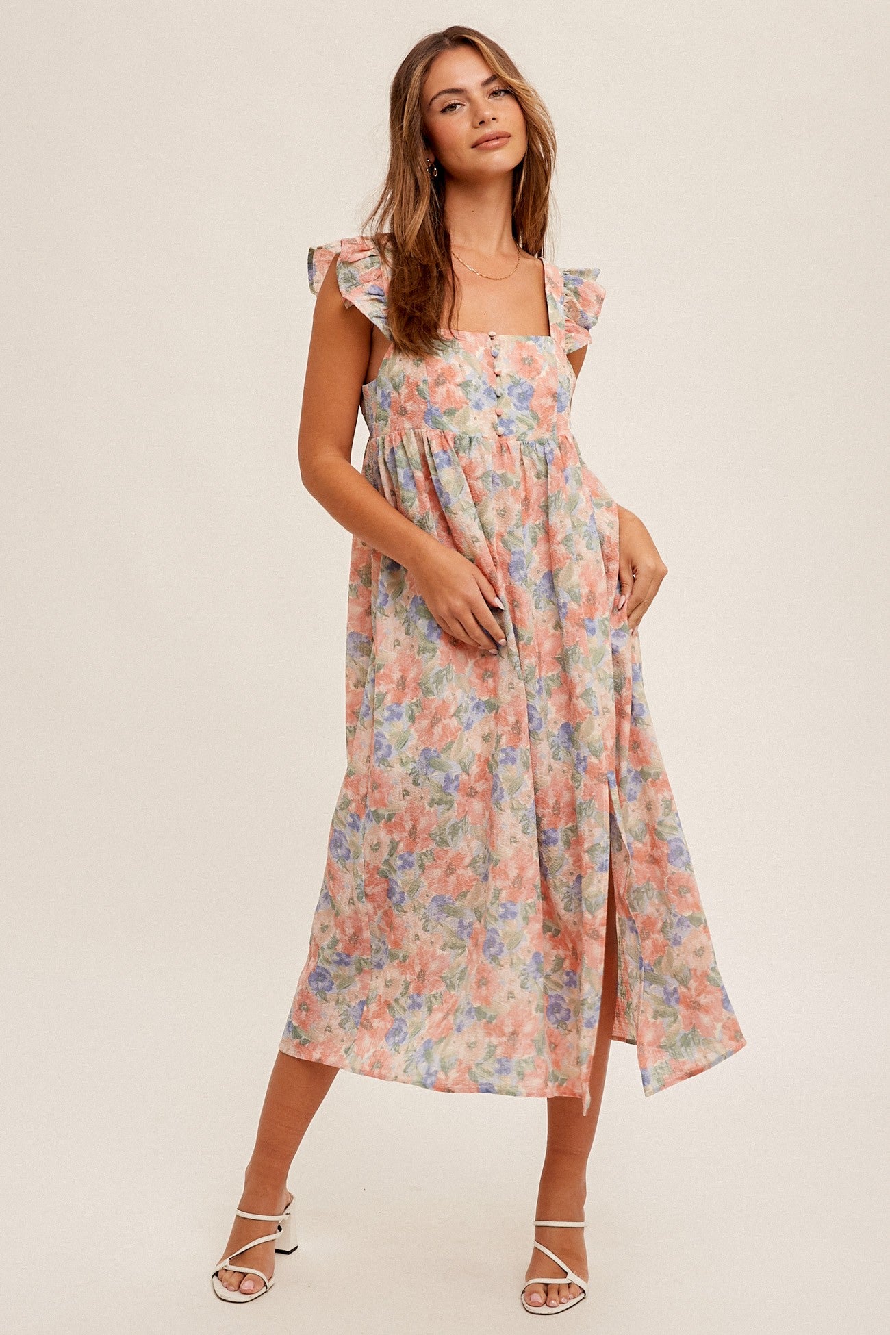Camila Floral Print Ruffle Sleeve Midi Dress (Rose Pink)