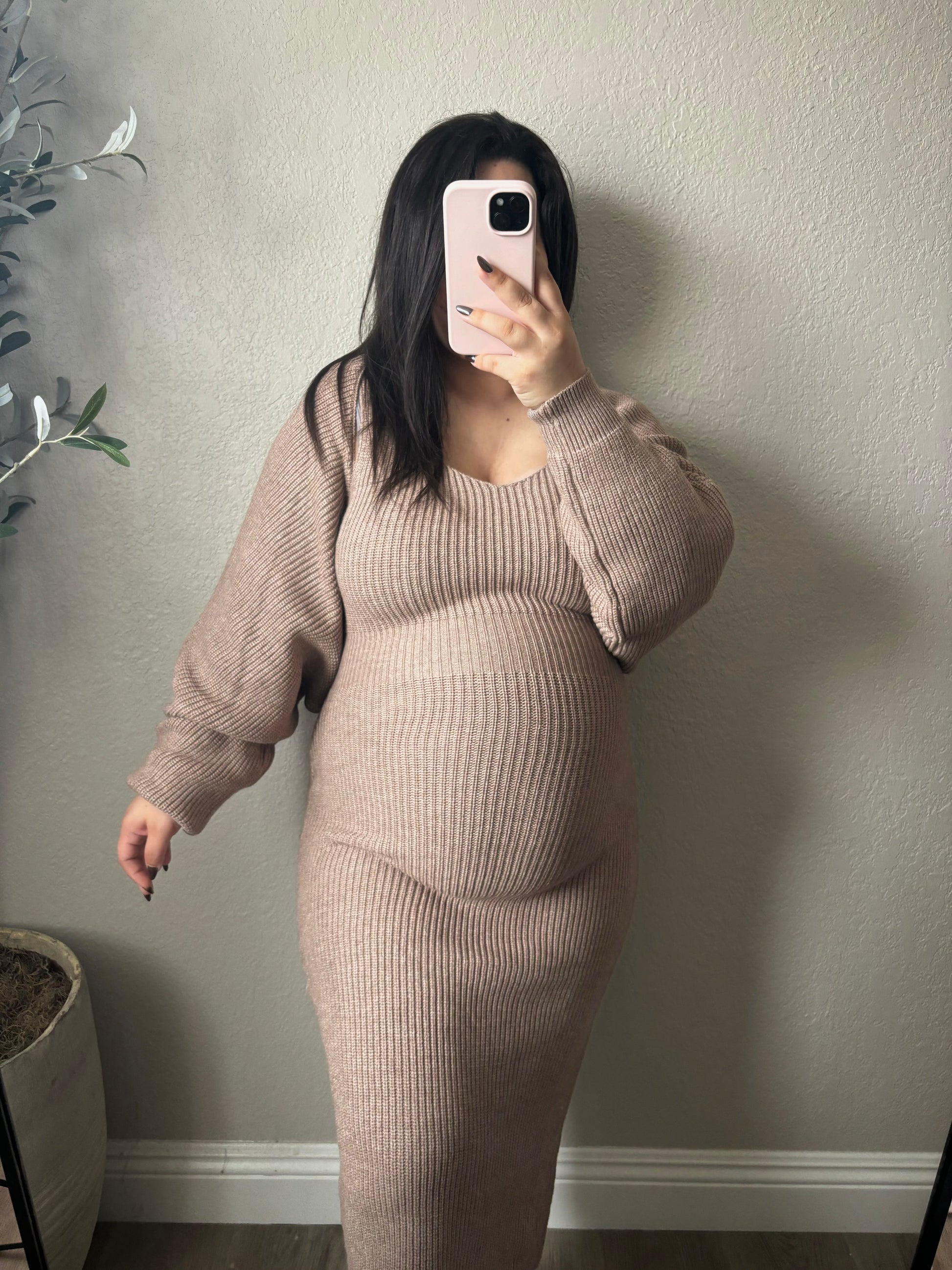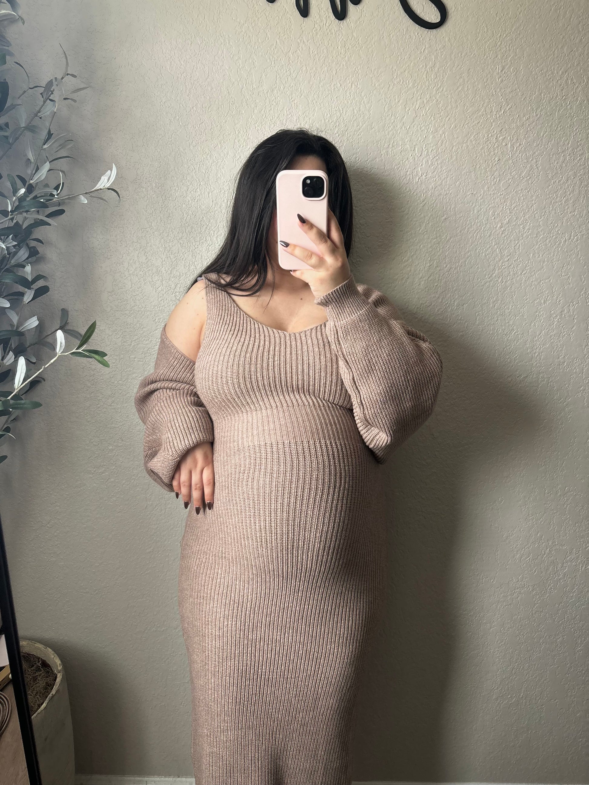 Knit V-Neck Midi Dress & Shrug Set- Latte