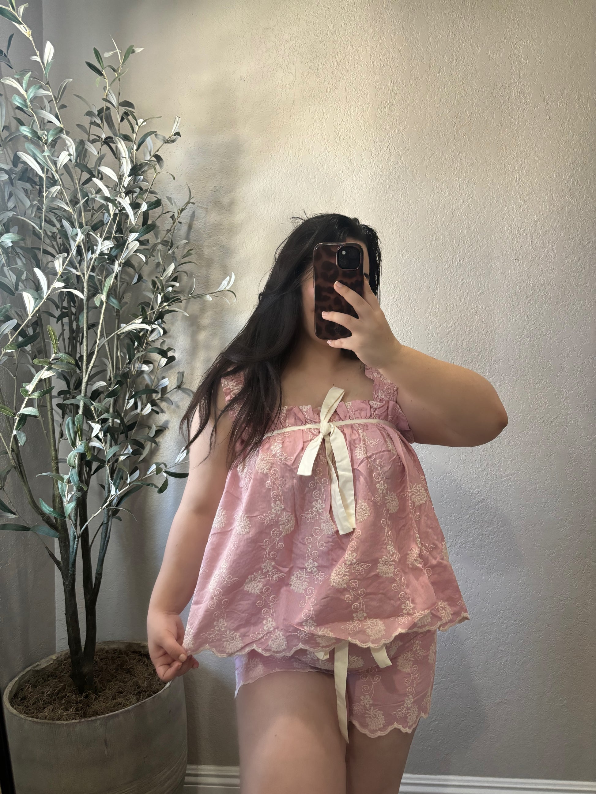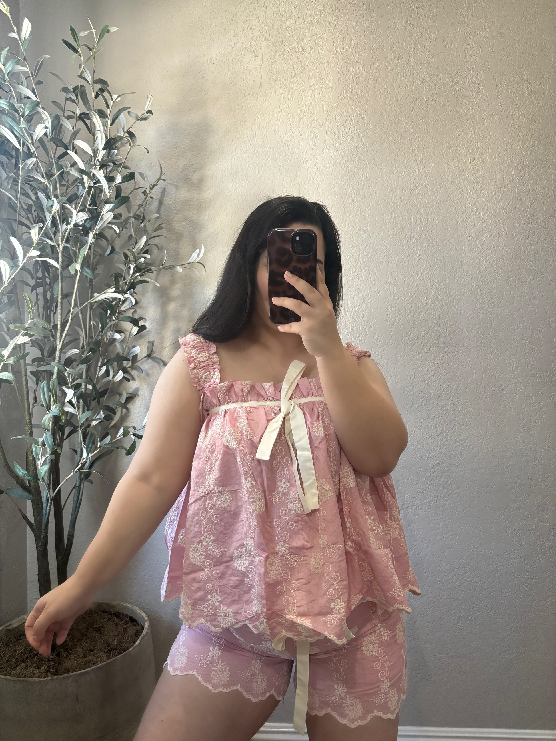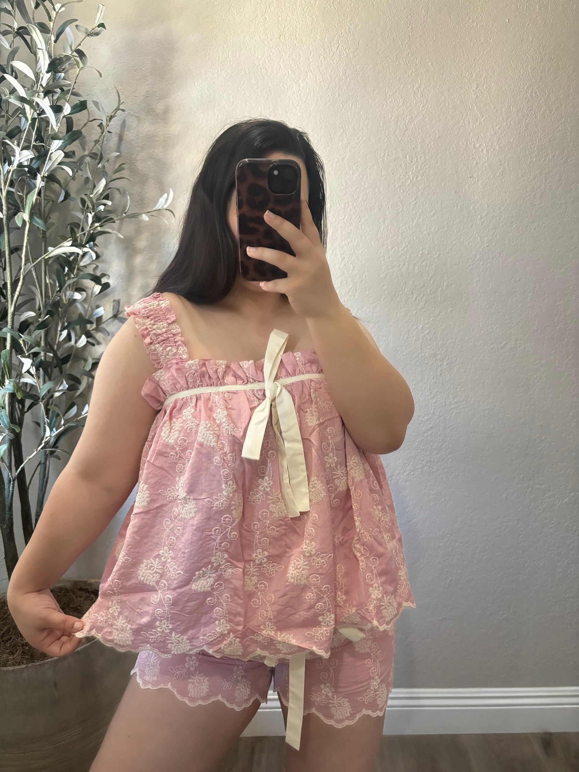 Featuring delicate lace detailing, a flowy babydoll-style top, and matching shorts finished with sweet ribbon bows, this set is designed for comfort without sacrificing femininity.