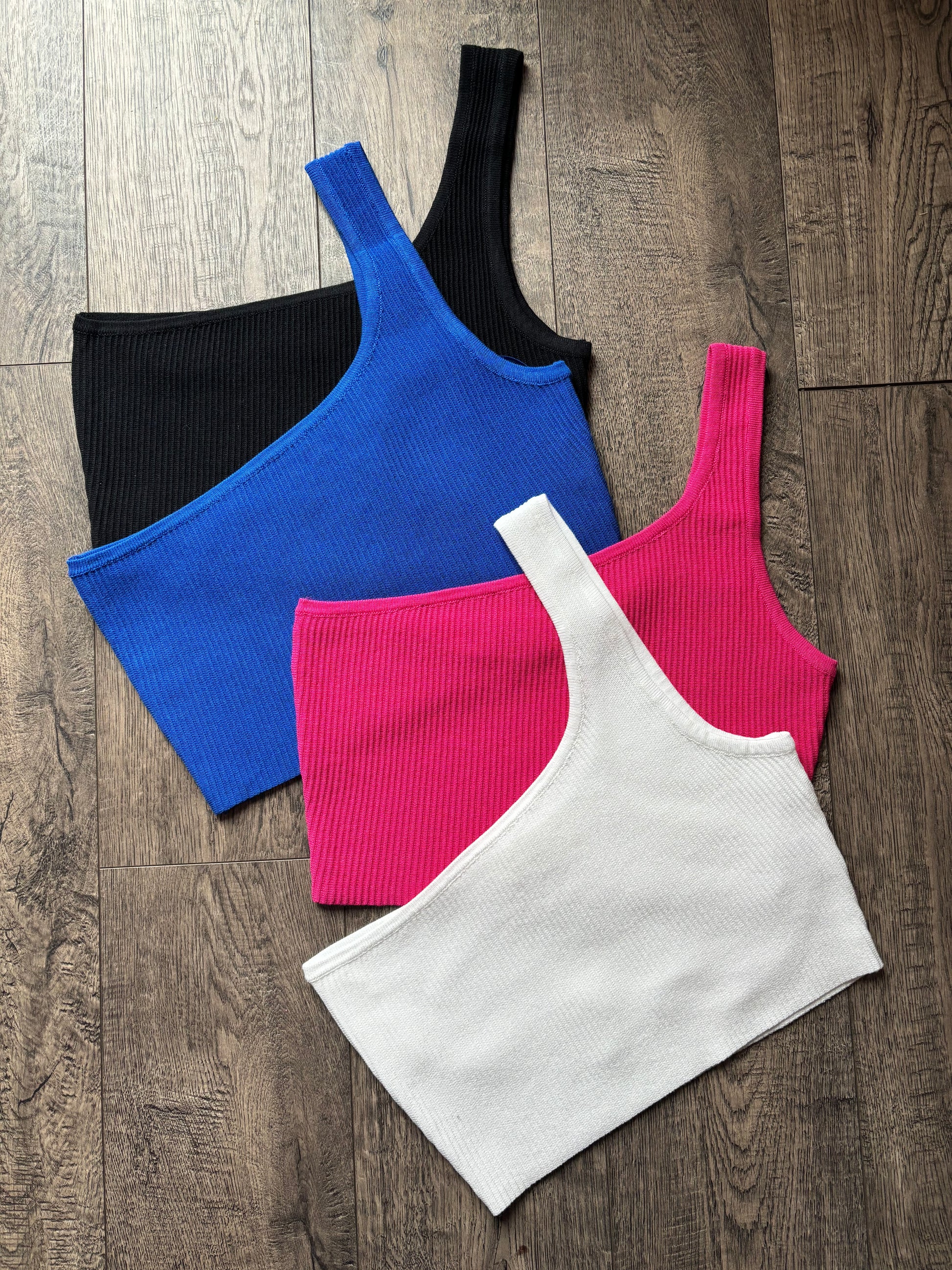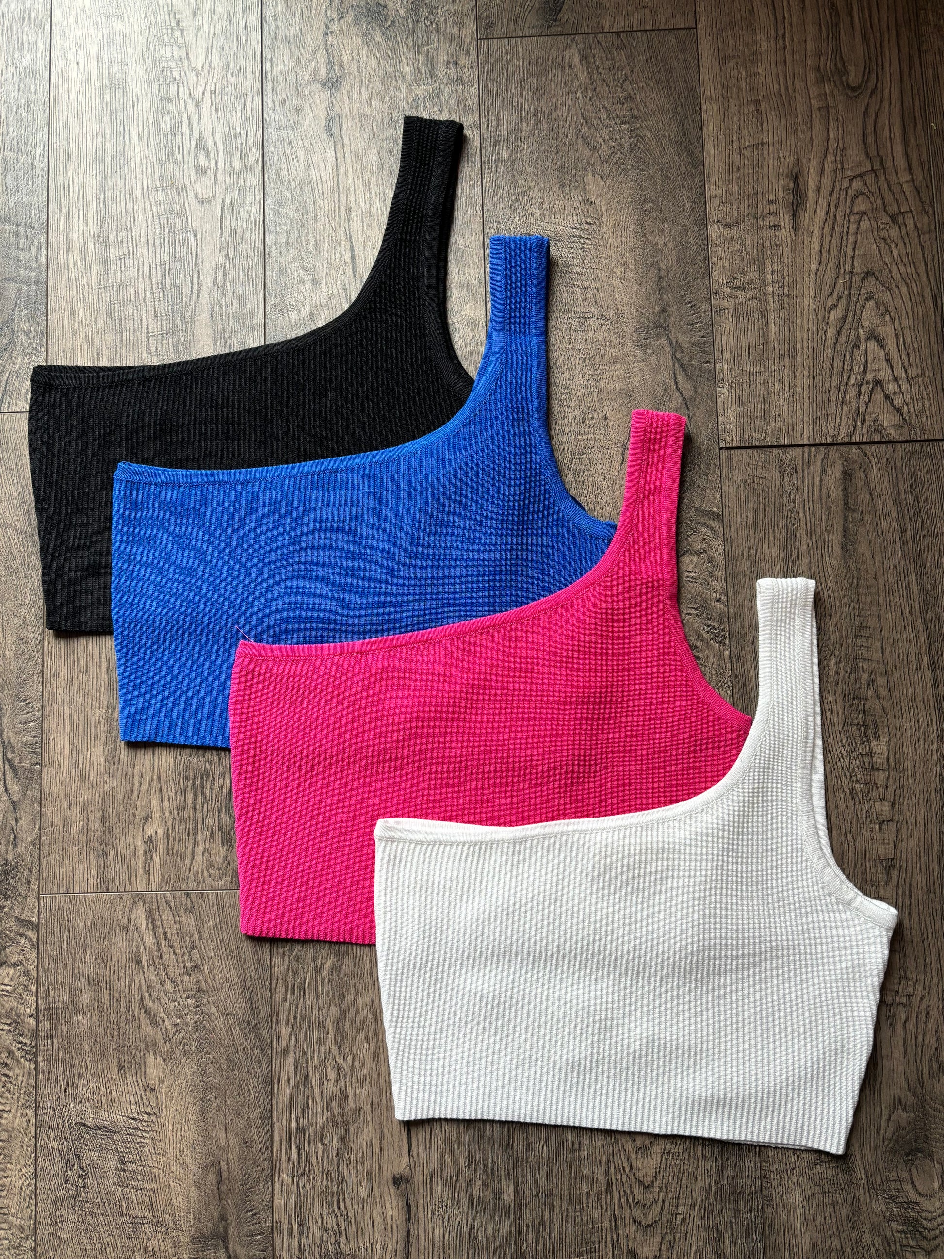 Introducing our Asymmetrical One Shoulder Rib Knit Crop Tank Top – a chic and modern addition to your wardrobe. This tank top features an asymmetrical one-shoulder strap and a rib-knit texture, creating a stylish and contemporary silhouette. Crafted for comfort and versatility, this crop tank top is perfect for a casual day out, can be dressed up for a trendy evening look, used to lounge it, or even get your next pump in at the gym!