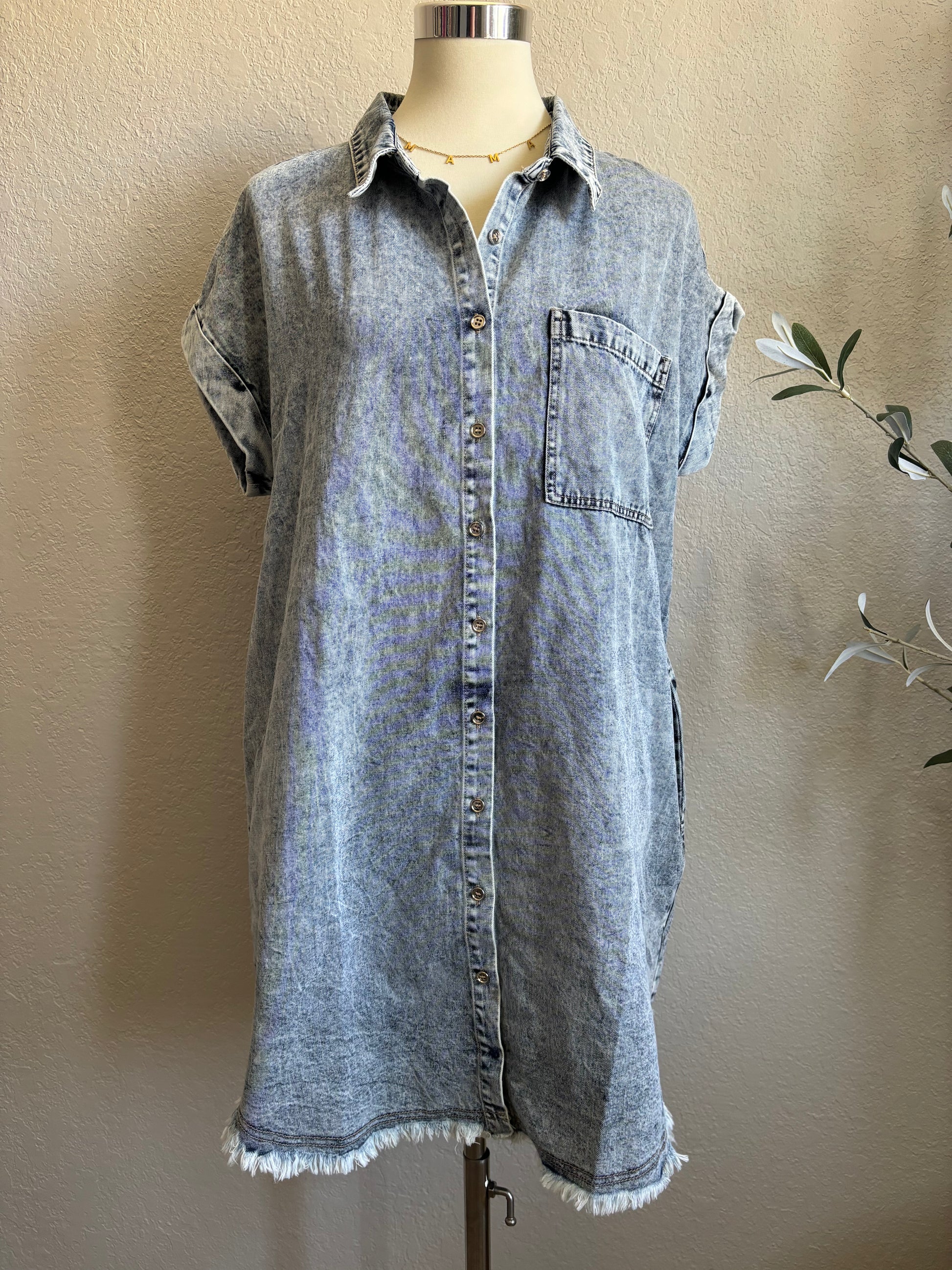 Acid wash denim shirt dress featuring a front button closure and raw edge frayed hem with a breast pocket, short sleeves, side pockets, relaxed fit.