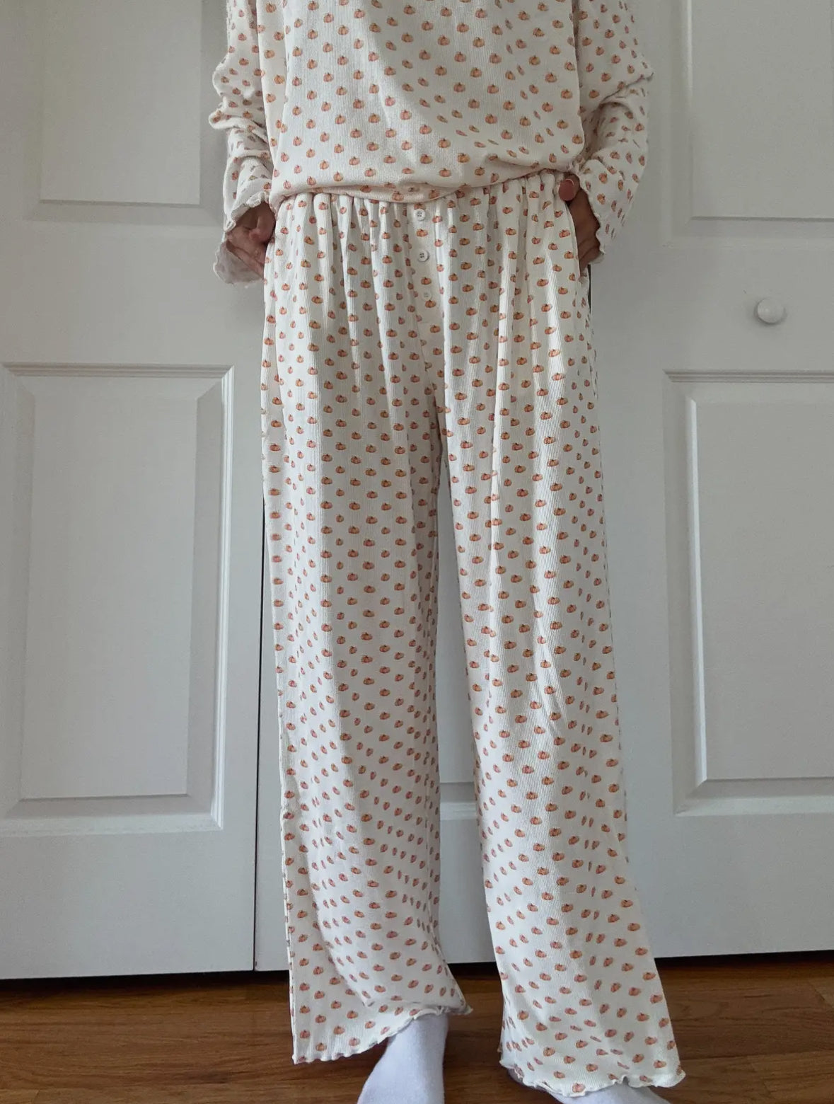 Featuring a lightweight, buttery knit fabric with the cutest mini pumpkin print, this set includes a relaxed long-sleeve top and flowy wide-leg pants that move with you. The easy, breathable fit makes it perfect for lounging at home or layering up with your favorite fall cardigan.