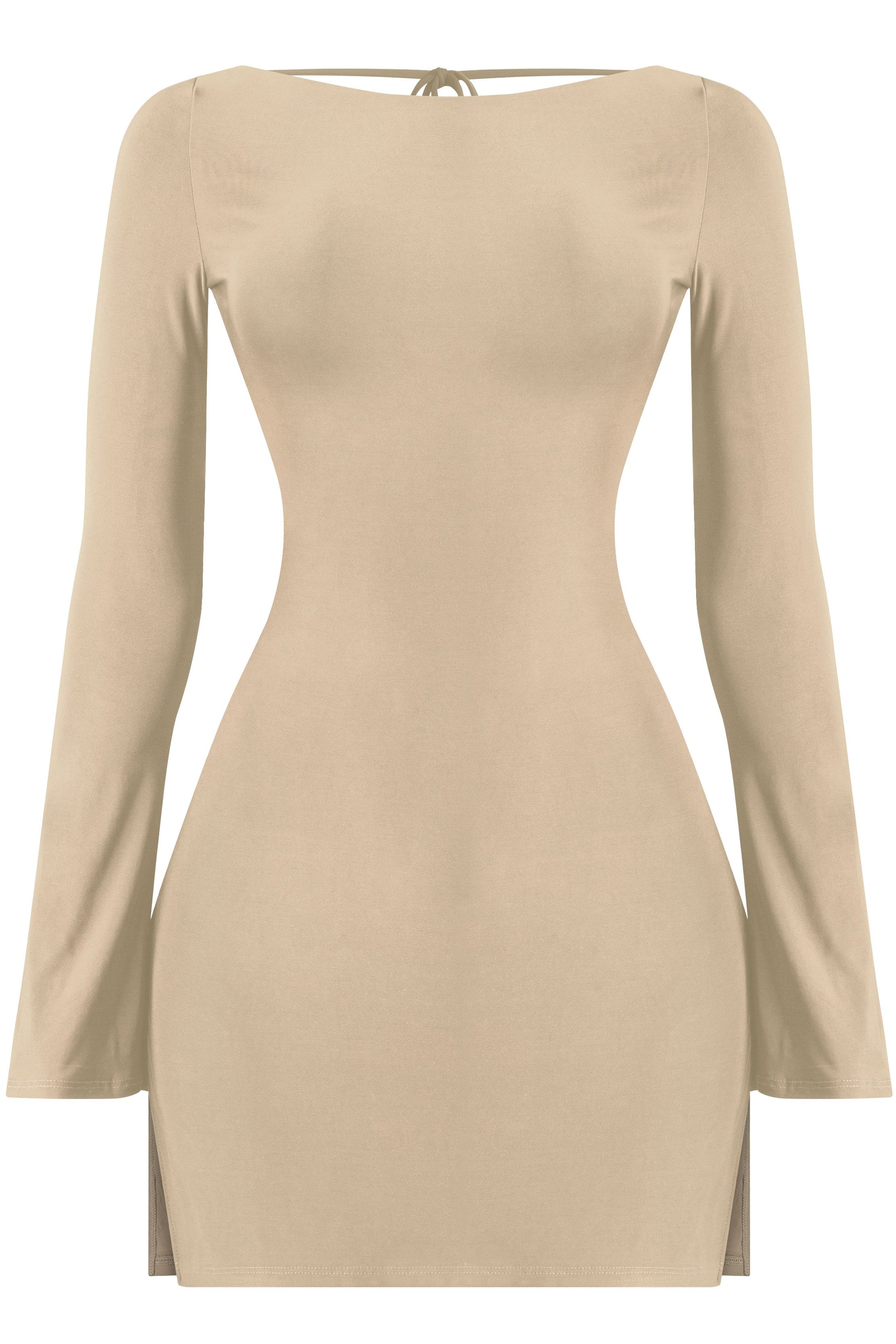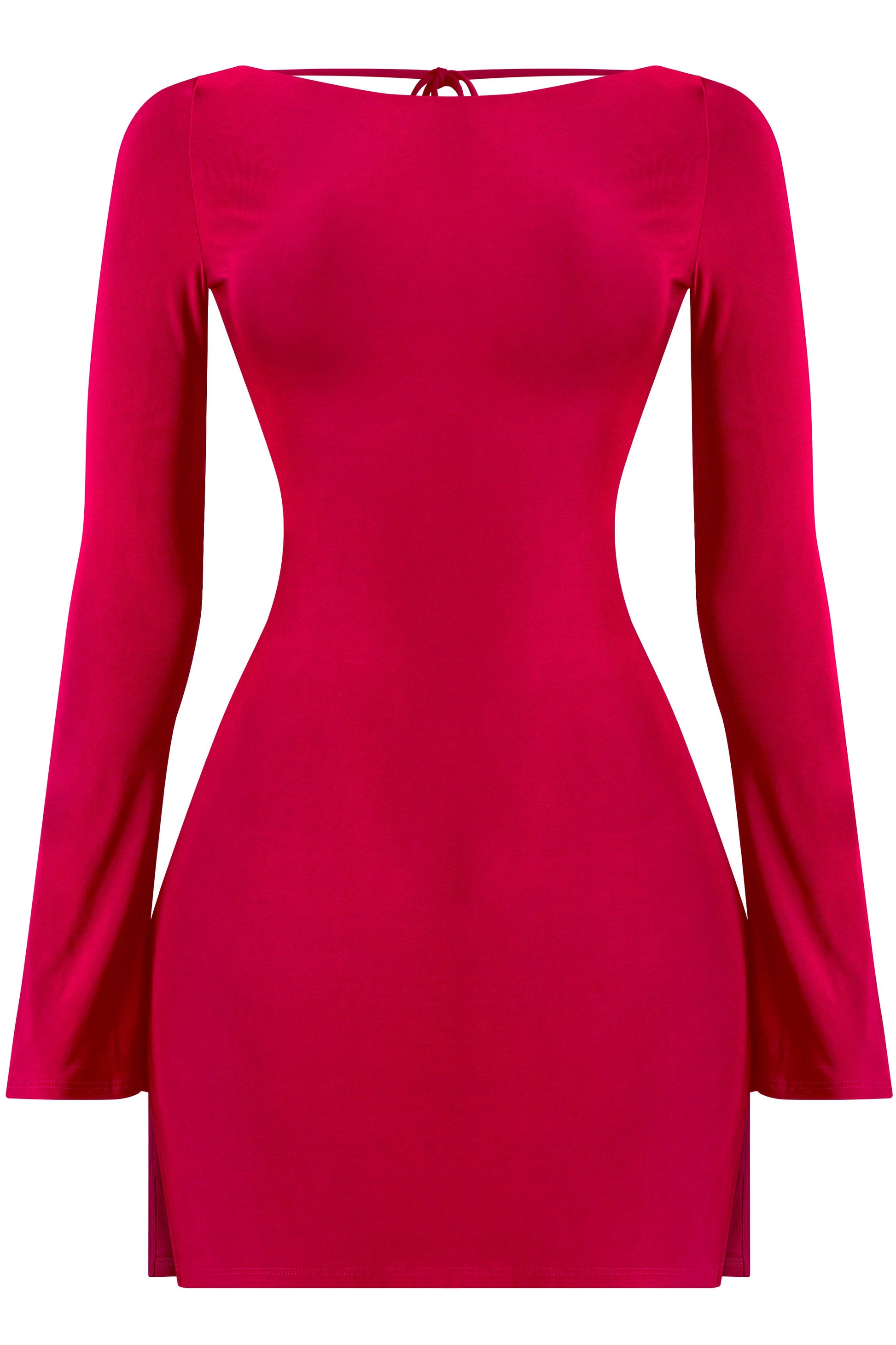 This Tami Mini Dress (More Colors) boasts long bell sleeves, a boat neckline, and an open back with back drawstring ties. Its double layered design and mini length make for a stylish and flattering look. Made from a stretchy material, this dress is crafted with 94% polyester and 6% spandex for a comfortable and flexible fit.